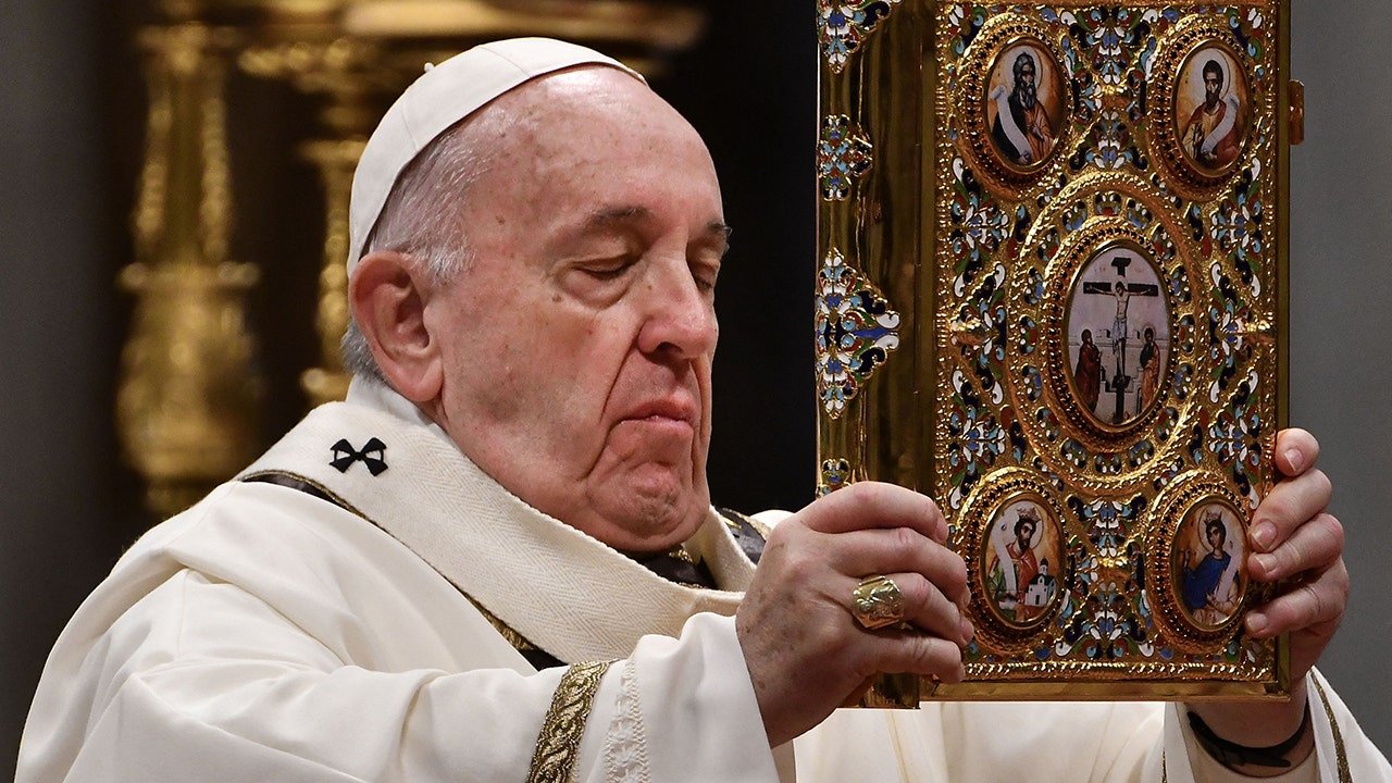 Pope Francis holds the Holy Ebook of Prayers as he celebrates the Epiphany mass on January 6, 2020, at St. Peter’s Basilica within the Vatican. (Vincenzo Pinto/AFP through Getty Photos)