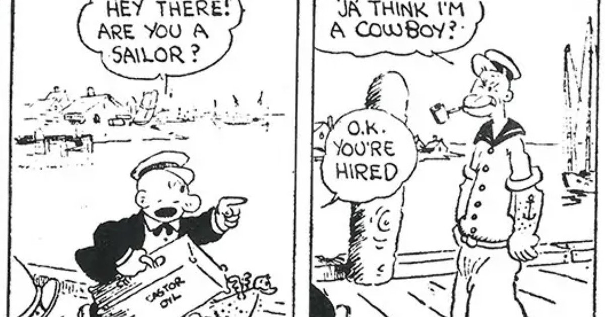 The listing additionally contains Popeye, who first appeared in E.C. Segar’s Thimble Theatre sketch, with a narrative titled “Gobs of Work.” However this Popeye isn’t the one which eats spinach to develop huge muscle mass; the brawny sailor didn’t begin consuming spinach to achieve power till 1932 (although the very first Popeye may nonetheless pack a punch).