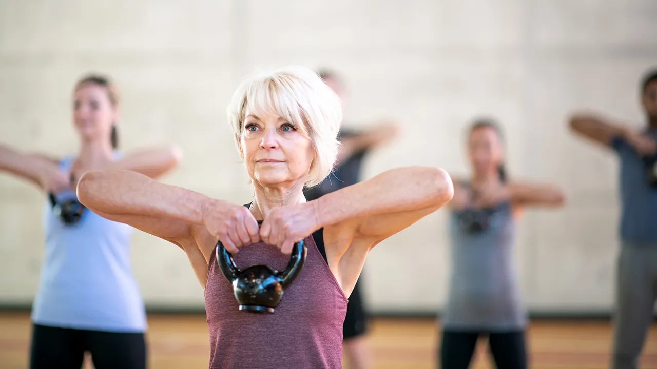 A fit senior woman is carrying a dumbbell in her fitness class.